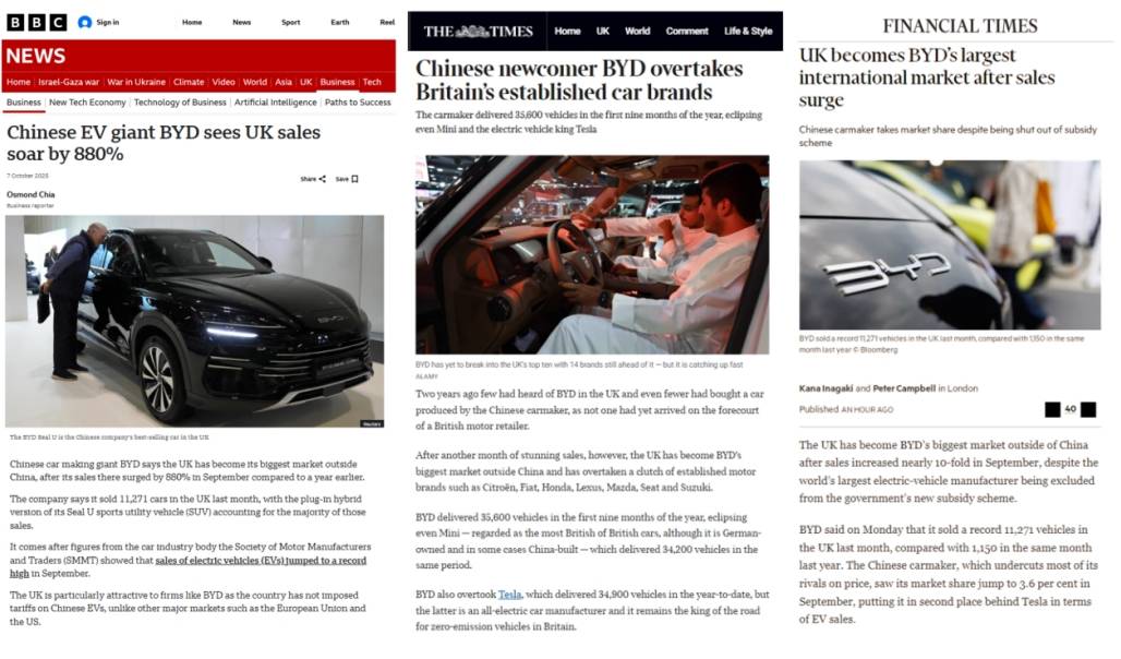 比亞迪在英國市場的高速增長,也吸引了英國主流媒體的高度關注。英國廣播公司(BBC)報道“中國電動汽車巨頭比亞迪9月英國銷量創(chuàng)下新高”;《泰晤士報》則以“中國新晉品牌比亞迪超越英國老牌汽車品牌”為題,指出“兩年前英國幾乎沒人聽說過比亞迪”;《金融時報》更進一步強調“英國成為比亞迪最大的國際市場”。