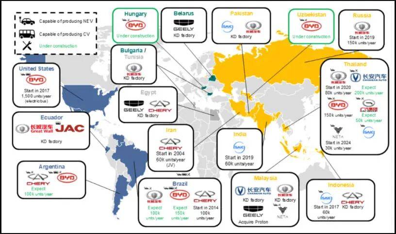 中國(guó)汽車出口的質(zhì)變,源于企業(yè)戰(zhàn)略思維從貿(mào)易思維向全球化思維的根本轉(zhuǎn)變。越來(lái)越多的中國(guó)車企正踐行“全球化思維,本土化實(shí)施”的理念,由簡(jiǎn)單的產(chǎn)品出口向產(chǎn)業(yè)出口轉(zhuǎn)型。它們大力拓展海外市場(chǎng),建立研發(fā)/設(shè)計(jì)中心、海外區(qū)域總部和整車工廠,實(shí)現(xiàn)本地化生產(chǎn)、本地化供應(yīng)鏈、本地化管理、本地化銷售和服務(wù)。