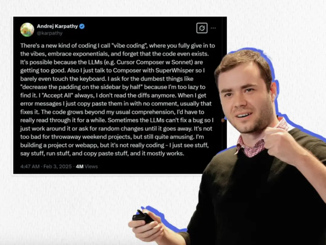 「Vibe coding」在中文里并沒有一個完美的翻譯,比較流行的譯法是「氛圍編程」。這個詞最早由特斯拉前 AI 總監、OpenAI 創始工程師 Andrej Karpathy 提出,形象地描述了 AI 能讓人們「幾乎忘記代碼本身存在」也可以開發應用的情景。