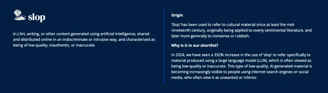 在無人注意的角落,牛津去年的年度詞匯候選列表里,還有另一個與 AI 直接相關的詞,「slop」,意指「由人工智能生成的劣質網絡內容」。雖然最后沒能當選,但它出現在提名中本身就說明,AI 生成的內容,數量已經到了惹人反感的地步。
